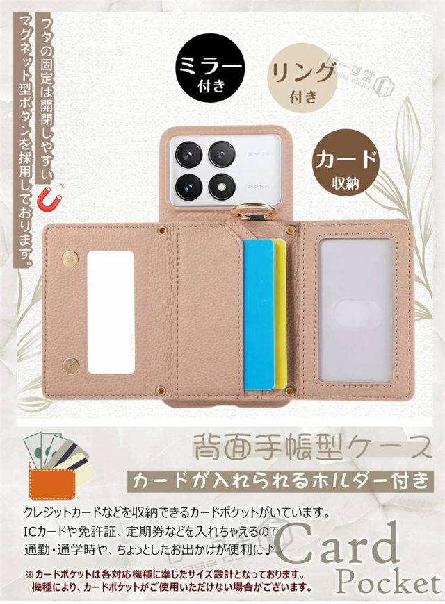 ショルダーストラップ&カード収納ポケット&カラビナリング&ミラー付き、大人気のショルダースマホケースが登場!