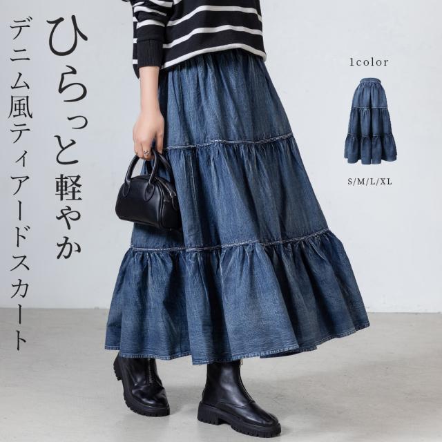 秋新作 「ふわっと華やか」ティアードスカート ロング デニム風 フレア レディース ボトムス Aライン フレアスカート ウエスト バッグゴム ティアード 切り替え ふんわり 体型カバー 無地 デイリー 通学 ガーリー 薄手 春 夏 秋 冬 オールシーズン 黒