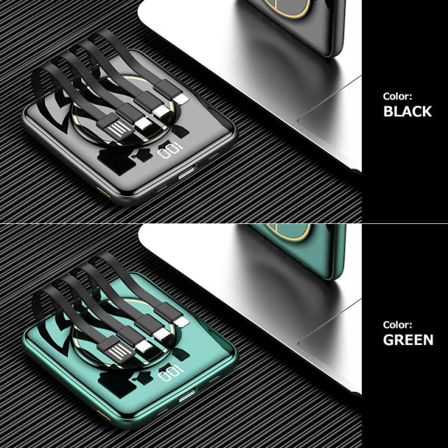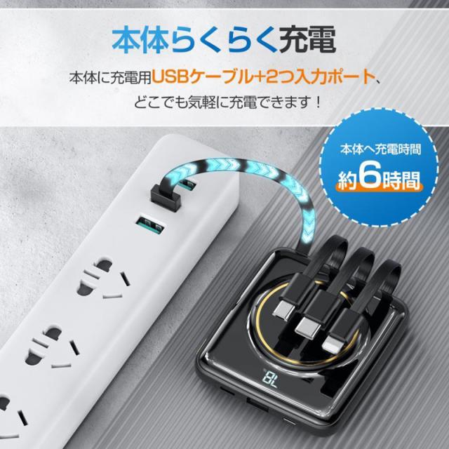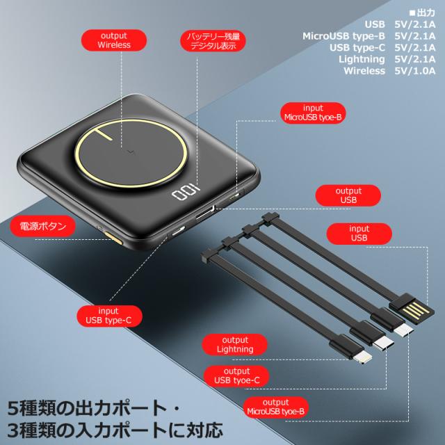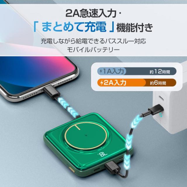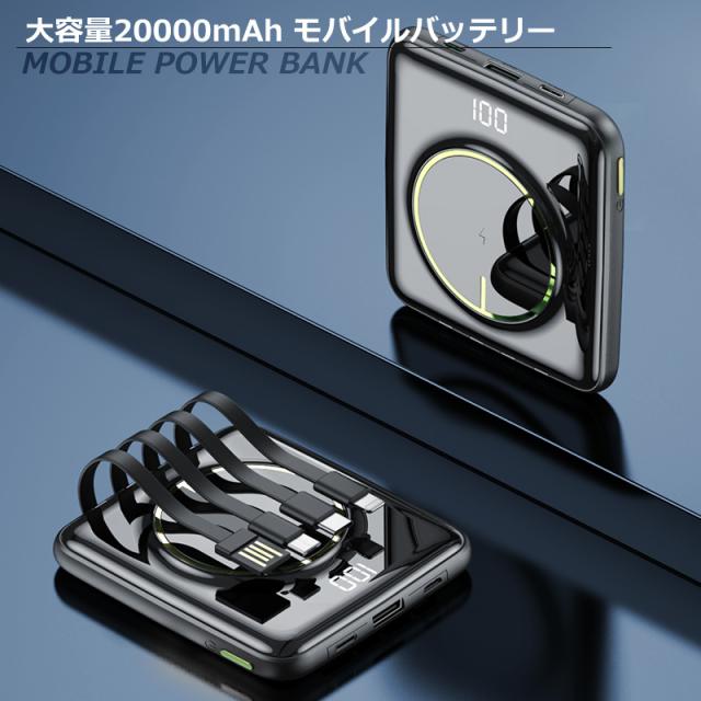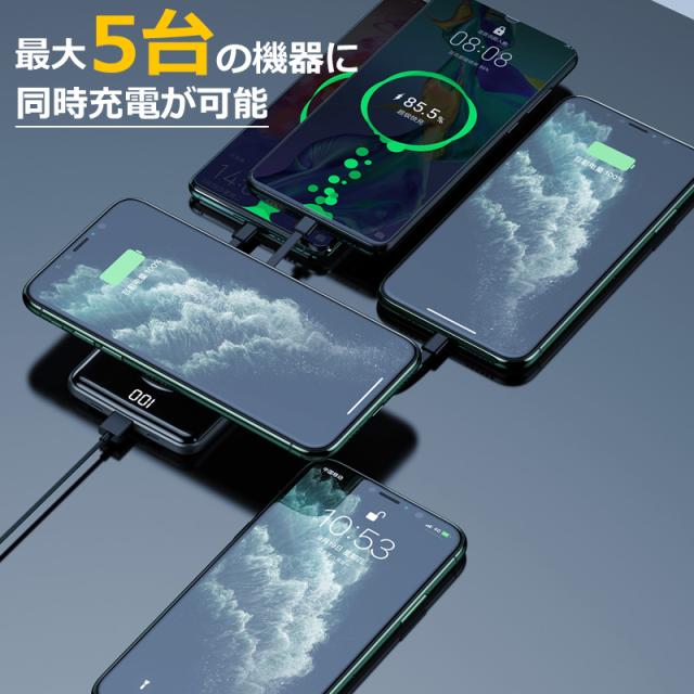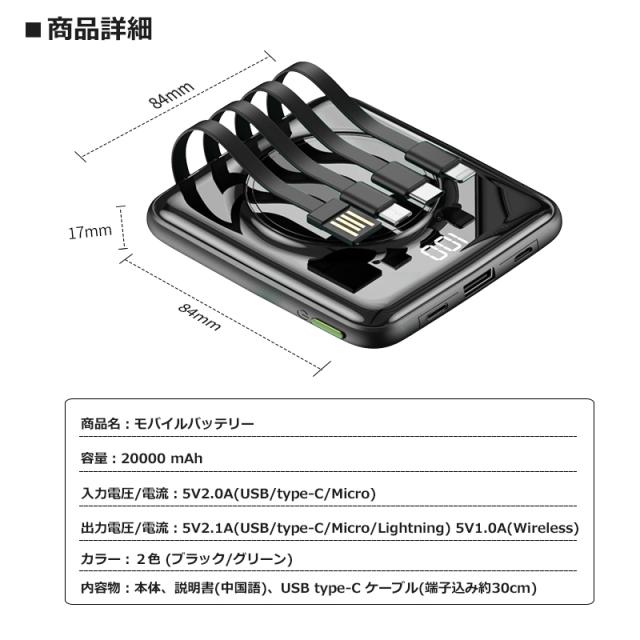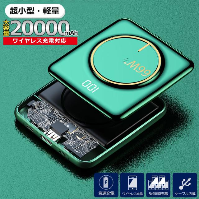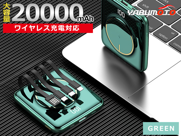 大容量 モバイルバッテリー 20000mAh グリーン ワイヤレス充電 軽量 5台同時 ケーブル内蔵 type-C Lightning PSE認証 メール便 送料無料