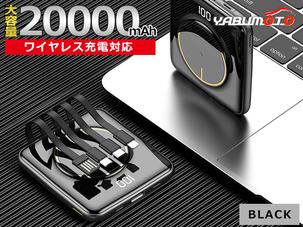 大容量 モバイルバッテリー 20000mAh ブラック ワイヤレス充電 軽量 5台同時 ケーブル内蔵 type-C Lightning PSE認証 メール便 送料無料
