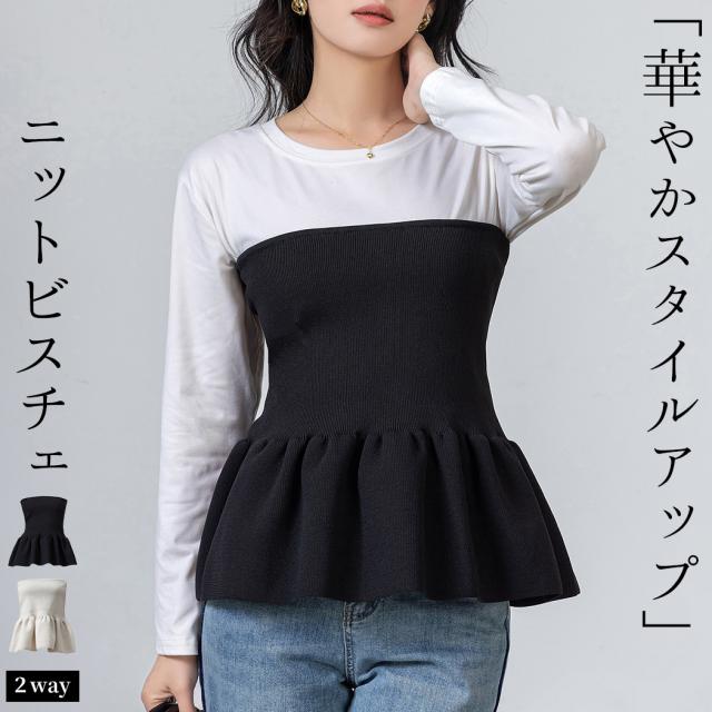 秋新作 「切り替えで細ウエスト」ビスチェ トップス ニット レディース ベアトップ チュニック ペプラム 前後2way ファスナー ハーフジップ レイヤード 重ね着 コーデ スタイルアップ 通勤 オフィスカジュアル 通学 ワンマイルウェア 黒 春秋