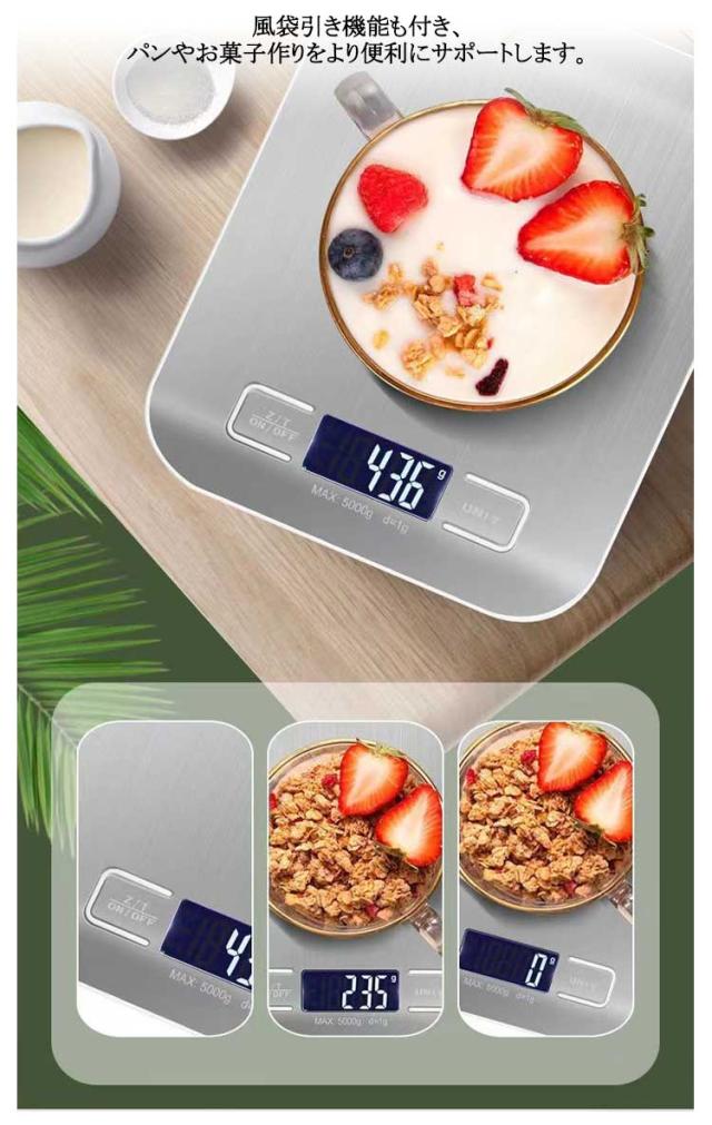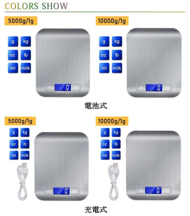 電子測り 防水 5kg キッチンスケール 電子はかり 1g単位で 10kg 料理用 LCDディスプレイ 計量器 クッキングスケール ステンレス お菓子作り デジタル コンパクト 風袋引き機能 mlモード付き 高精度 充電式 電池式
