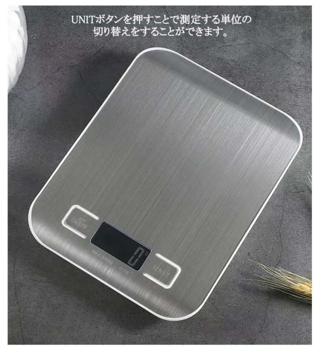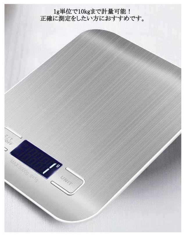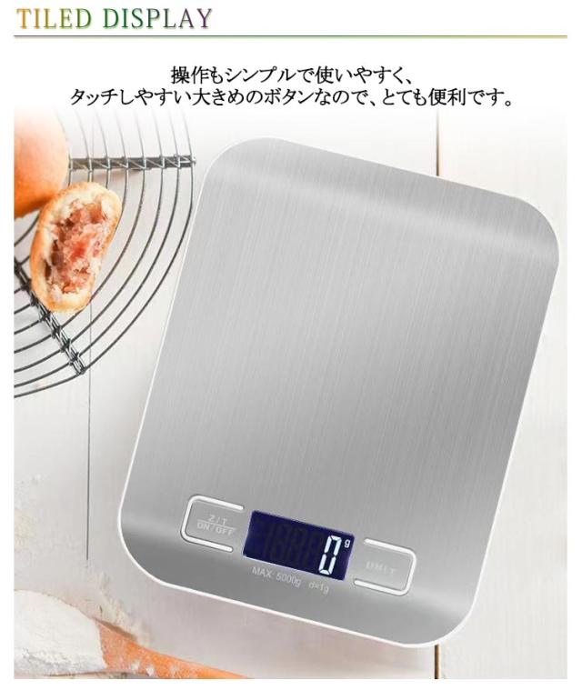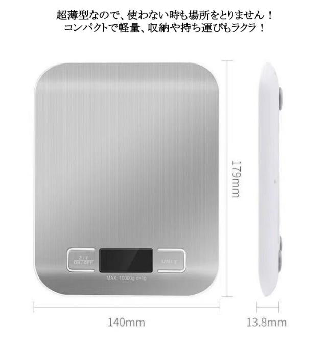| デザイン性と実用性の兼用!精確性にとことんこだわったキッチンスケールです! 重さを表示するLCD液晶にバックライトを搭載しさらに見やすくしました! 操作もシンプルで使いやすく、タッチしやすい大きめのボタンなので、とても便利です。 1g単位で10kgまで計量可能!正確に測定をしたい方におすすめです。 風袋引き機能も付き、パンやお菓子作りをより便利にサポートします。 UNITボタンを押すことで測定する単位の切り替えをすることができます。 超薄型なので、使わない時も場所をとりません!コンパクトで軽量、収納や持ち運びもラクラ! | |