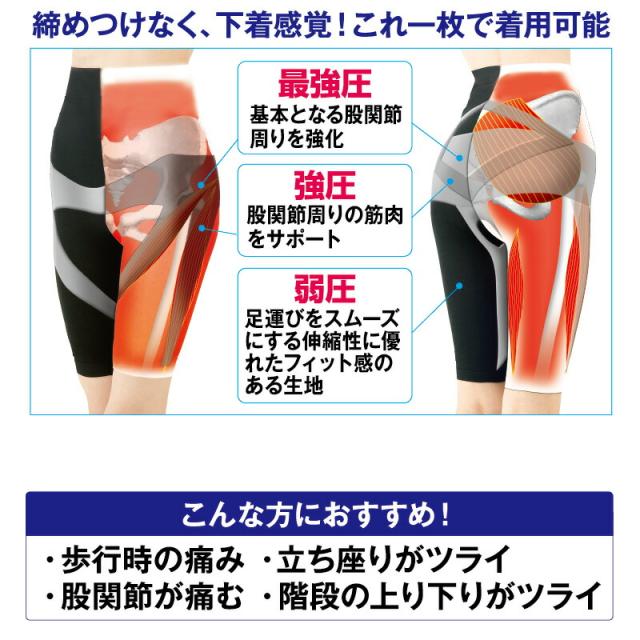 吸湿発熱パイル加工 股関節スパッツ スリムな下半身は股関節から!! ぽかぽか あったか素材のパイルテーピング機能付 股関節 履くだけ 歩行サポート 深履き お腹すっぽり 一枚履きOK ![]() ![]() ![]() | ||||