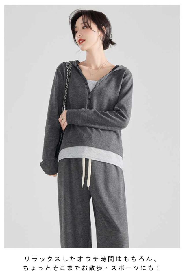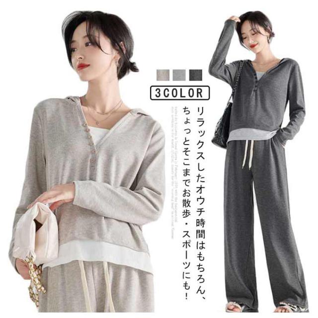 | リラックスしたオウチ時間はもちろん、ちょっとそこまでお散歩・スポーツにも! スタイルをよく見せてくれるセットアップ。 トップスはゆったりとしたシルエットでリラックス感を演出します。 パンツはウエストゴムで履きやすく、おうち時間を軽快にしてくれる。 | |
