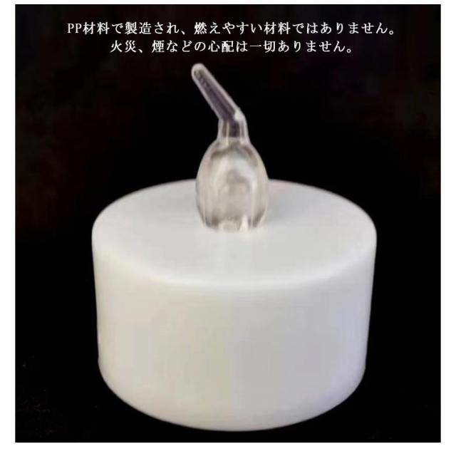 | LED キャンドルライト 100個セット 火の元の心配なしでキャンドル代わりに照明やイルミネーションとして使えます。 LEDの光に微妙な強弱を付けることで本物のキャンドルの揺らめきを再現しています。 PP材料で製造され、燃えやすい材料ではありません。火災、煙などの心配は一切ありません。 | |