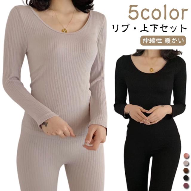 5色 保温 インナー レディース リブ 上下セット 暖かい ルームウエア 長袖 伸縮性 リブ パンツ 肌着 冬 冷え防止 パジャマ 春 秋 防寒 インナーシャツ パジャマ ラウンドネック Uネック