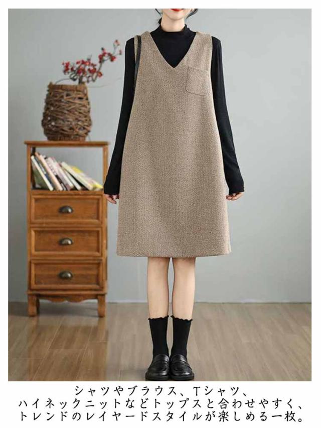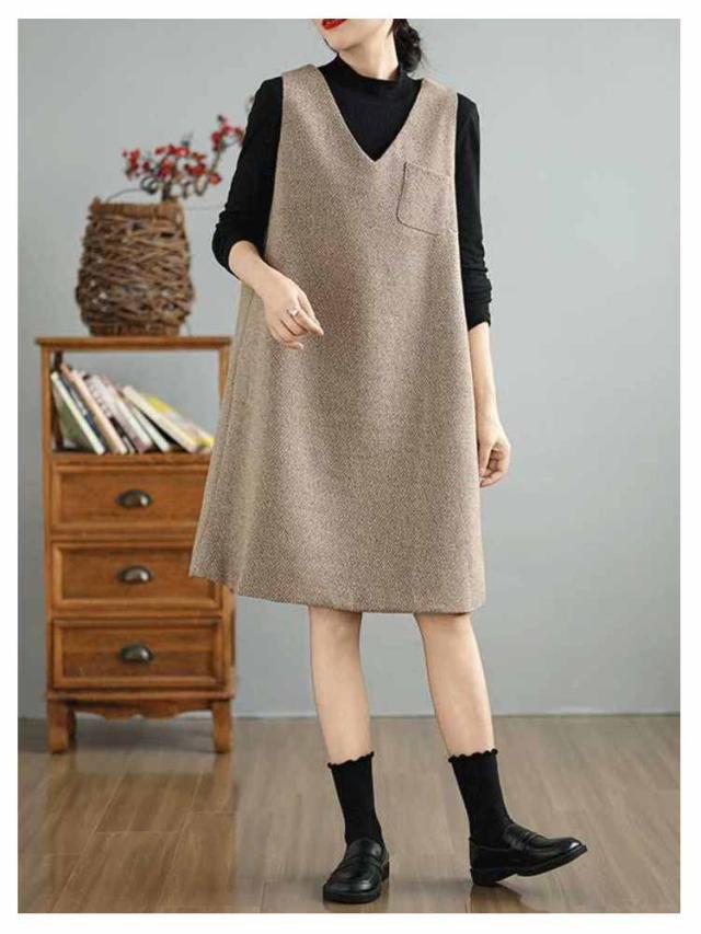 膝丈 ノースリーブワンピース 体型カバー ジャンパースカート Aライン Vネック 厚手 秋冬 ワンピース ミディアム丈 サロペットワンピース オフィスカジュアル 低身長 ジャンパースカート ジャンスカ チュニックワンピース