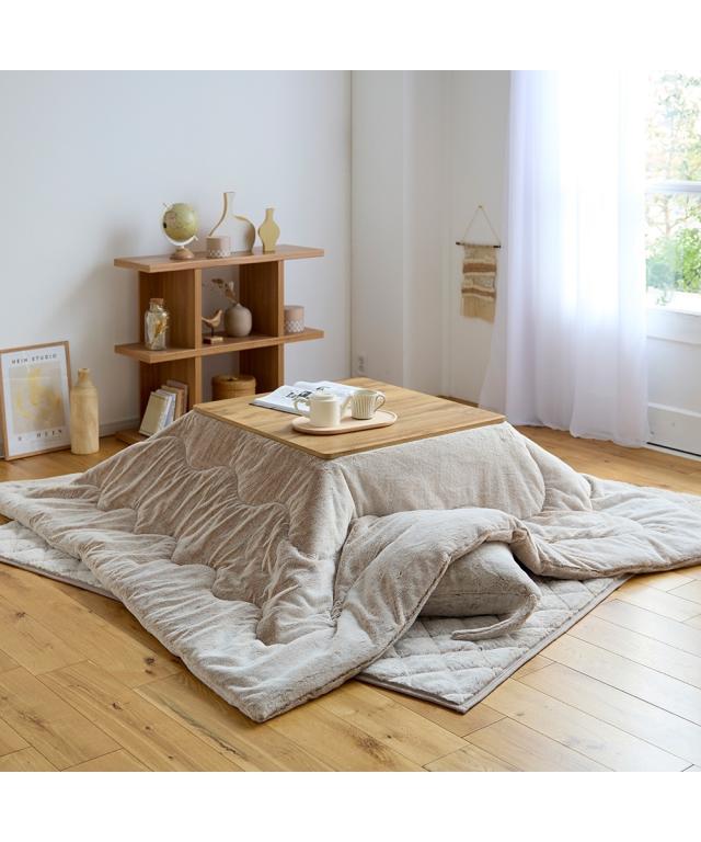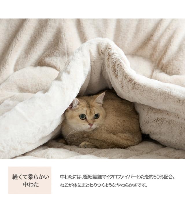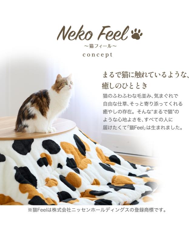 猫が好き。そして猫に触れているととても暖かい。 その暖かさ、心地よさを追求したこたつ掛け布団が新登場。 リビングでいつでも触れるとろとろの手触り。ふかふかトロトロの毛足がキモチいい。 冷気が入りにくく、体に沿いやすいようにドレープ性を重視。 中わたに極細繊維のマイクロファイバーわたを50%入れることで身体にまとわりつくような仕様にしています。 正方形、長方形、長方形大と3サイズからお選びいただけます。 少し大き目の大判タイプにすることでゆったりお寛ぎいただけるサイズにしました。 もちろん洗えるウォッシャブルなのでいつも清潔にお使いいただけますよ。 猫Feelは色、柄の出し方、毛並み、毛足の長さ・・・何度も試作を重ねた今季おすすめの猫Feelを是非ご使用下さい。