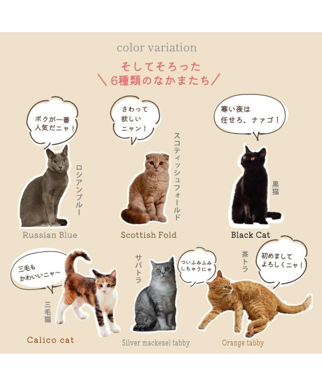●品質:側地=ポリエステル100%、詰め物=ポリエステル100% ※素材の特性上、ご使用中の摩擦により、毛羽落ち毛玉が発生し、他のものに付着することがあります。 ※三毛猫・サバトラ・茶トラは生地の使用箇所によって柄の出方が異なります。 原産国:中国製 備考:洗濯機OK ネット使用