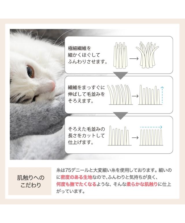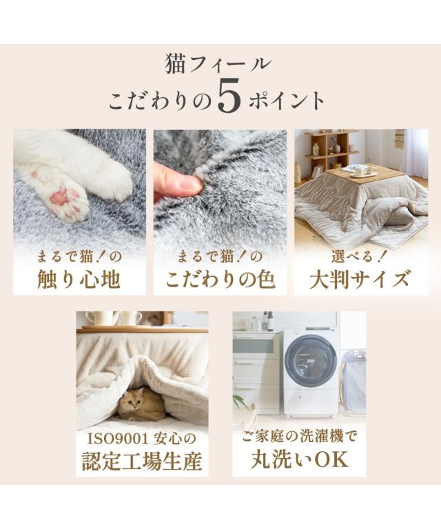 猫が好き。そして猫に触れているととても暖かい。 その暖かさ、心地よさを追求したこたつ掛け布団が新登場。 リビングでいつでも触れるとろとろの手触り。ふかふかトロトロの毛足がキモチいい。 冷気が入りにくく、体に沿いやすいようにドレープ性を重視。 中わたに極細繊維のマイクロファイバーわたを50%入れることで身体にまとわりつくような仕様にしています。 正方形、長方形、長方形大と3サイズからお選びいただけます。 少し大き目の大判タイプにすることでゆったりお寛ぎいただけるサイズにしました。 もちろん洗えるウォッシャブルなのでいつも清潔にお使いいただけますよ。 猫Feelは色、柄の出し方、毛並み、毛足の長さ・・・何度も試作を重ねた今季おすすめの猫Feelを是非ご使用下さい。