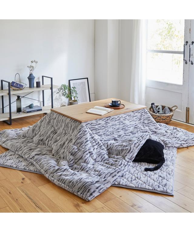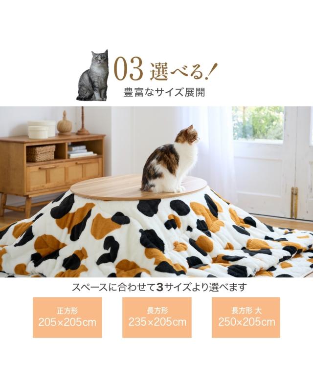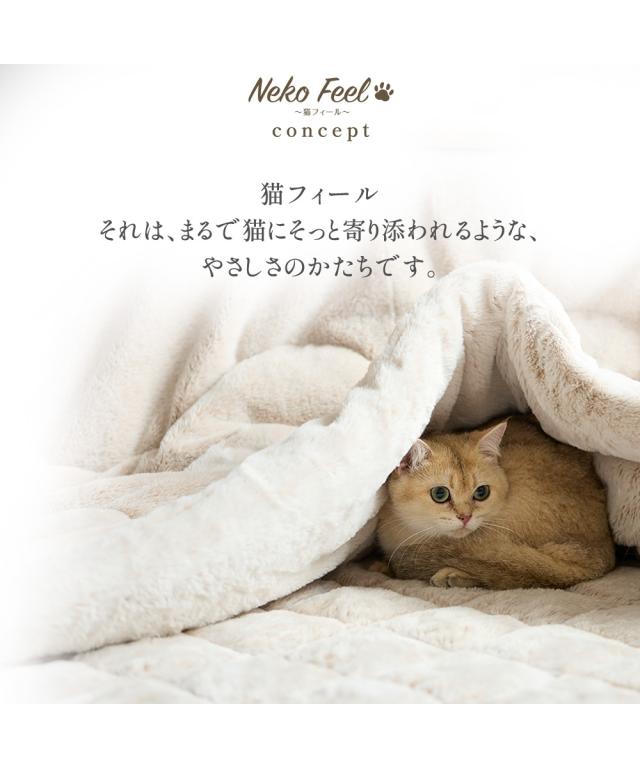 猫が好き。そして猫に触れているととても暖かい。 その暖かさ、心地よさを追求したこたつ掛け布団が新登場。 リビングでいつでも触れるとろとろの手触り。ふかふかトロトロの毛足がキモチいい。 冷気が入りにくく、体に沿いやすいようにドレープ性を重視。 中わたに極細繊維のマイクロファイバーわたを50%入れることで身体にまとわりつくような仕様にしています。 正方形、長方形、長方形大と3サイズからお選びいただけます。 少し大き目の大判タイプにすることでゆったりお寛ぎいただけるサイズにしました。 もちろん洗えるウォッシャブルなのでいつも清潔にお使いいただけますよ。 猫Feelは色、柄の出し方、毛並み、毛足の長さ・・・何度も試作を重ねた今季おすすめの猫Feelを是非ご使用下さい。