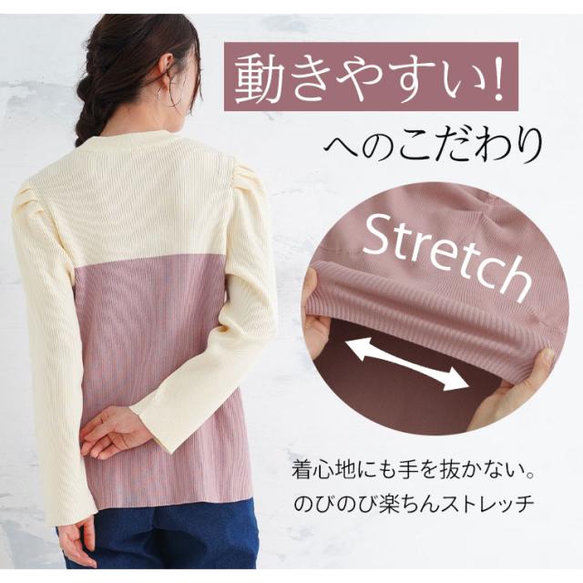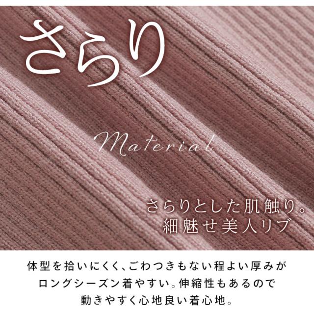 ■着用感:ちょうどいい、■着丈:ヒップ半分、■バスト:ちょうどいい、■腕回り:ちょうどいい、■袖口:ちょうどいい、■袖丈:長袖、首回りちょうどいい、■ウエスト:-、■ヒップ:-、■太もも:- ●伸びのよいリブニット素材で窮屈感のない楽ちんな着心地です。バスト周りと肩周りはややゆとりがありました。