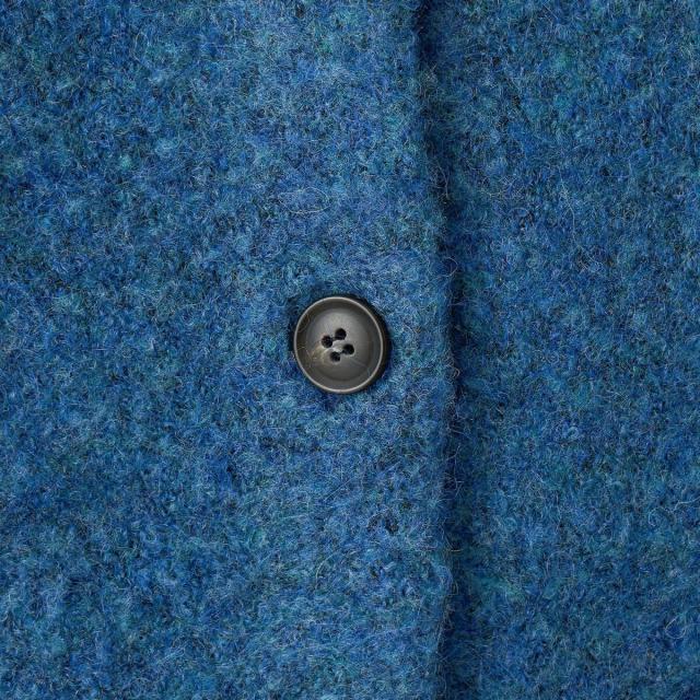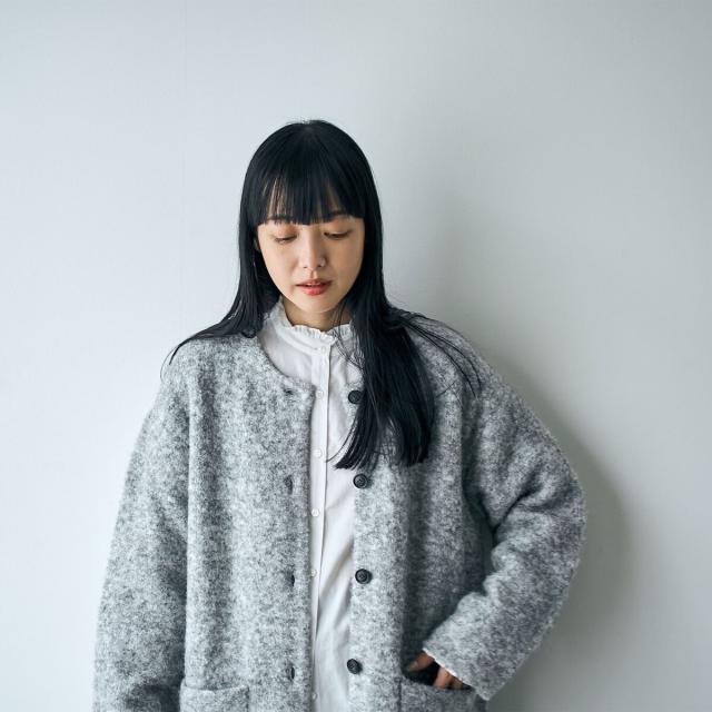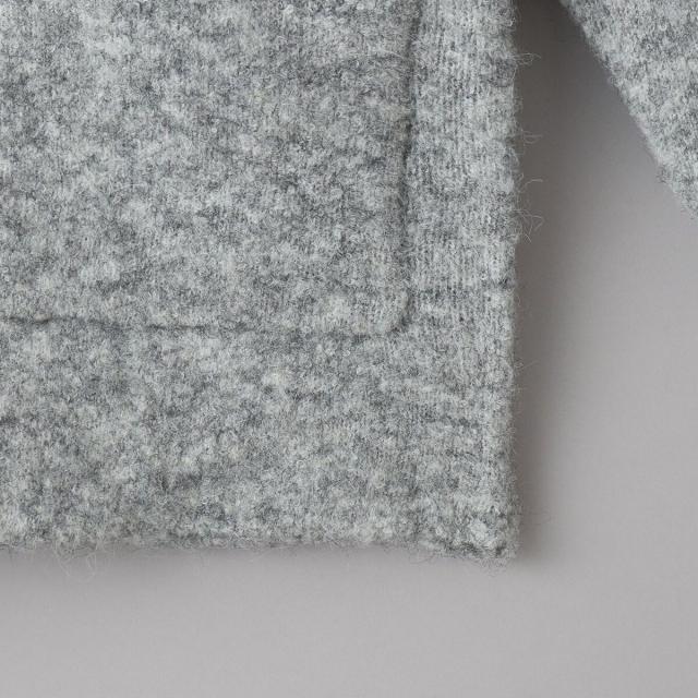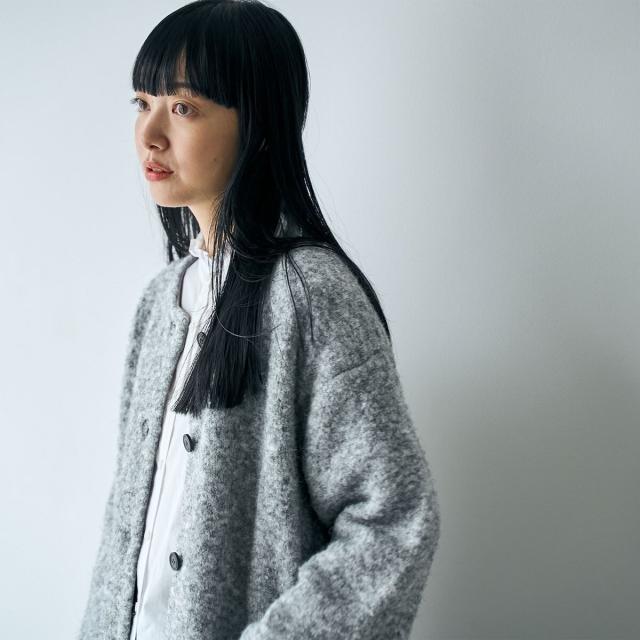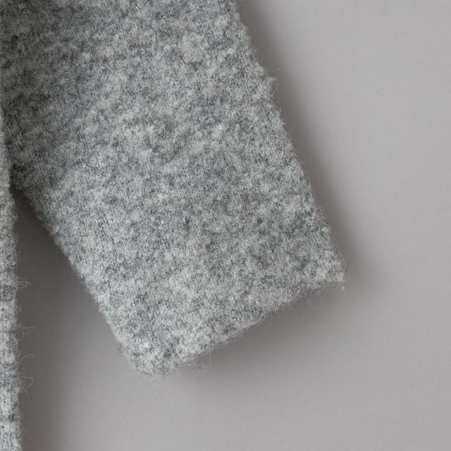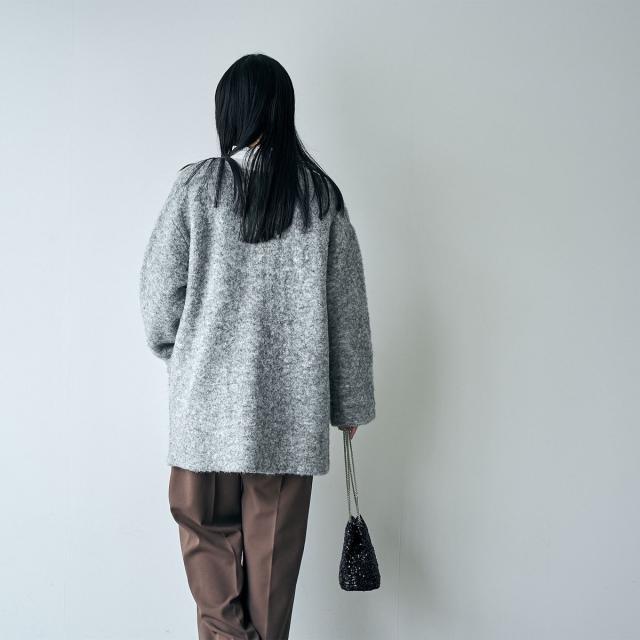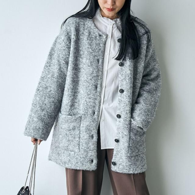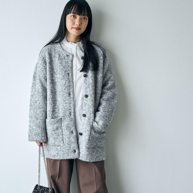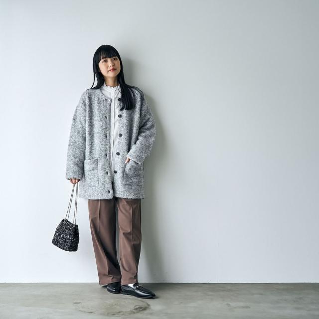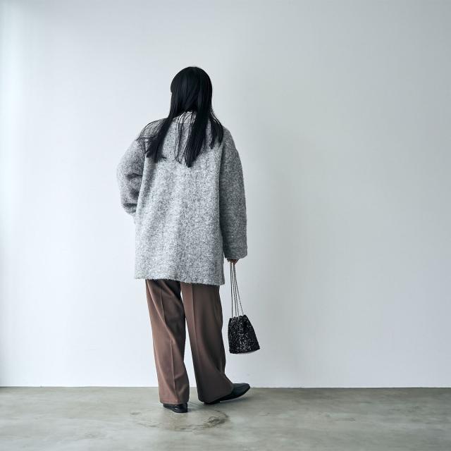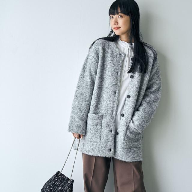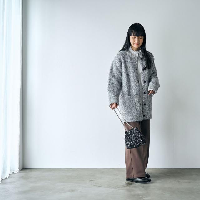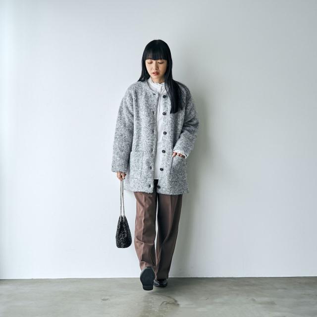 ノーカラーでスッキリとした首元にメランジニットのようなボディがトレンド感のある1着。