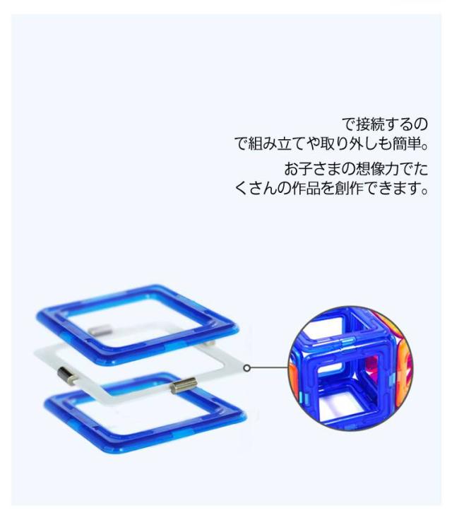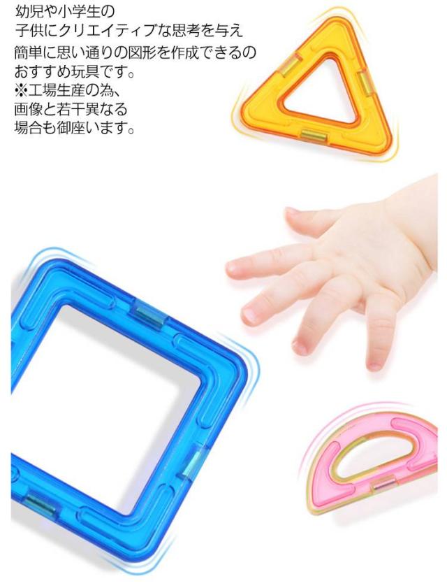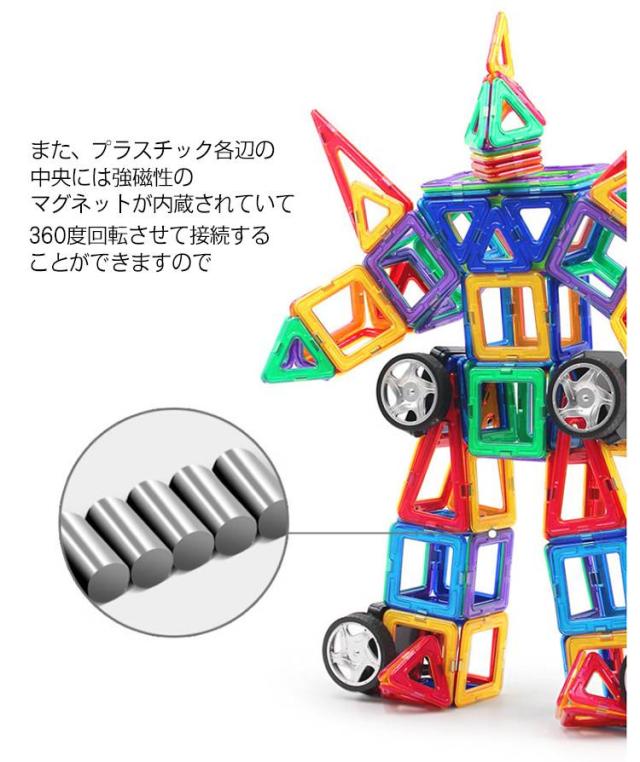 | マグネットで接続するブロックです。 作りたいカタチの図形をイメージし、それを実際にブロックで創作することによって、 平面図から立体物を作る感覚や想像力、創造力が養われます。 で接続するので組み立てや取り外しも簡単。 お子さまの想像力でたくさんの作品を創作できます。 安心素材/ABS樹脂を素材にしていますのでお子さまが口に入れても安心です。 また、プラスチック各辺の中央には強磁性のマグネットが内蔵されていて 360度回転させて接続することができますので 幼児や小学生の子供にクリエイティブな思考を与え 簡単に思い通りの図形を作成できるのおすすめ玩具です。※工場生産の為、画像と若干異なる場合も御座います。 | |