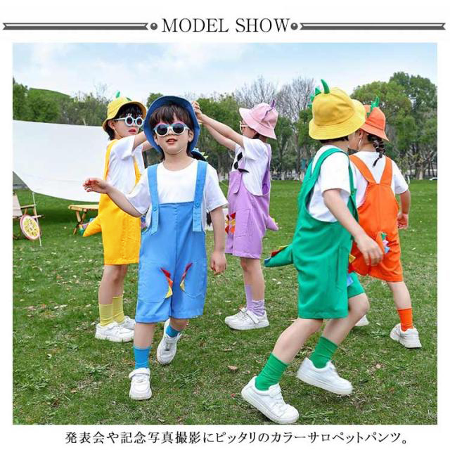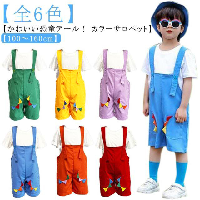 | 【かわいい恐竜テール! カラーサロペット】【全6色】【100〜160cm】 発表会や記念写真撮影にピッタリのカラーサロペットパンツ。 明るい色合い、こどもをより可愛く映えます。 ダンス、体操、イベントなどのチームウェアとしてオススメ。 シンプルなtシャツと合わせるだけで、デイリーも大活躍できます。 | |