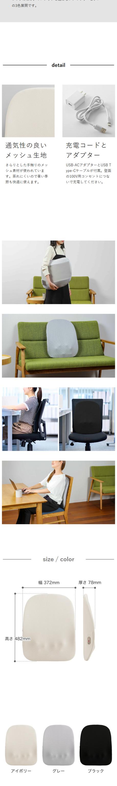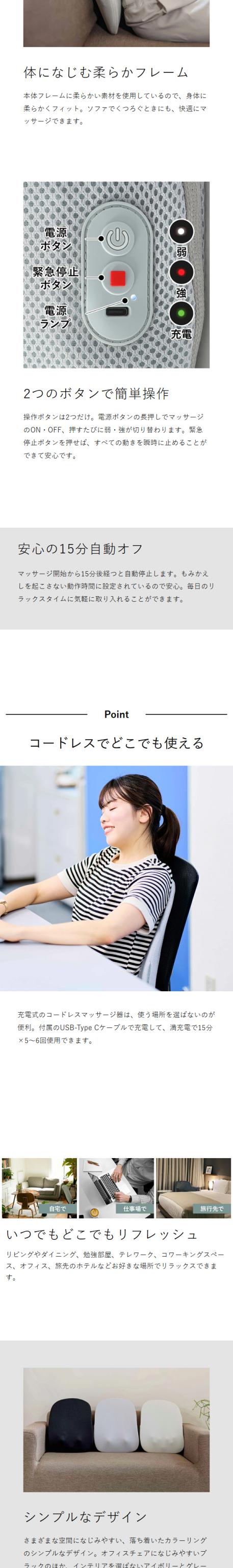 充電式のコードレスで、静かに背中のコリをほぐせる。医療機器認証特許済みの本格派薄型マッサージ器。デスクワーク中でも目立たない、軽いので持ち運びもラクラクです。