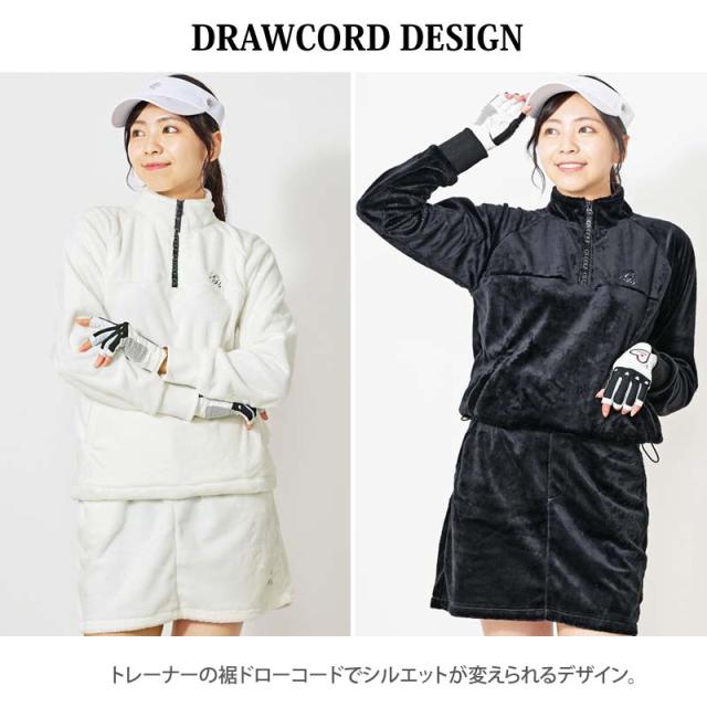 ハーフジップトレーナーとスカートのゴルフ上下セットアップ。