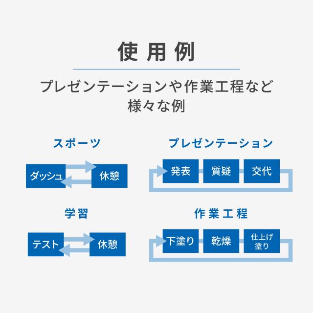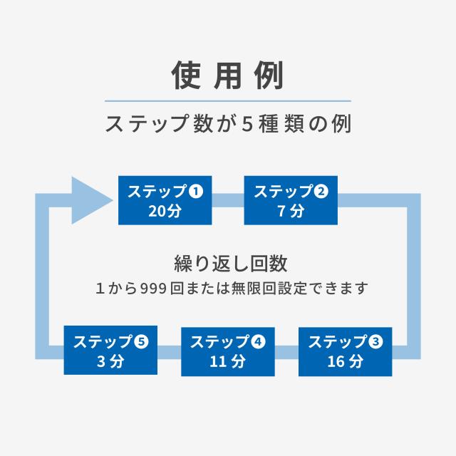 1から最大8ステップまでのタイマー時間の設定と記憶が可能で、順番に動作させることが可能です。 例えば、タイマー1とタイマー2の時間を設定してスタートすると、タイマー1→タイマー2の順番で自動的にカウントダウンします。