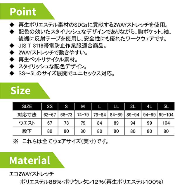 ◇機能:動きやすい2wayストレッチ・リサイクル・JIS T8118帯電防止作業服適合商品・ウエストストレッチで快適な履き心地・前中心は丈夫な3YGファスナー・両脇Dカンループ付・右脇カーゴポケット反射材付・両脇カーゴポケットファスナー付