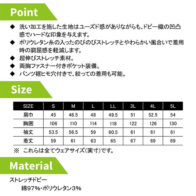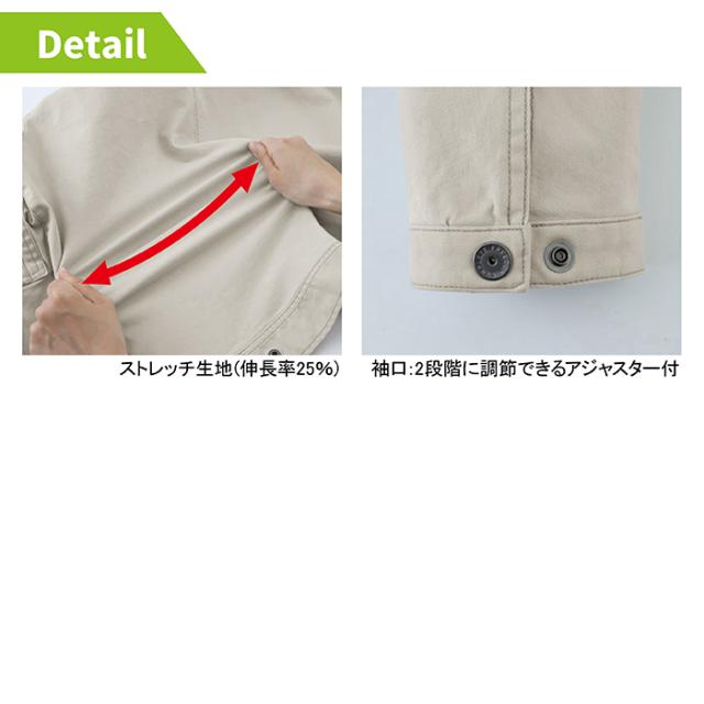 ◇機能:ストレッチ生地・右胸縦型ファスナーポケット・フラップ付ポケット・袖は動きやすい3Dカット・袖口は2段階に調整できるアジャスター付・左袖ペン差し・裾は金属製アジャストボタン付