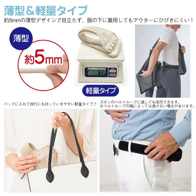 | 商品説明 | 軽い力でスーッと引っ張るだけ!驚きの固定力で腰をサポート!背筋シャキッ!グッと固定し、2本のボーンで腰をしっかり支え、安定させる腰ベルト。10個のループで軽い力でしっかり固定。10個のループにひもを通して力を分散させて、軽い力でスーッと引っ張るだけでがっちり締まります。2本のボーンで腰を支える。弾力のある2本のボーンが腰のラインにぴったりフィットし、支えてくれます。骨盤をしっかり固定することで腰がラクになり、姿勢をサポート!簡単着脱!腰に本体ベルトを巻いて、左右のストラップをスーッと引っ張ってとめるだけの簡単操作!薄型&軽量タイプ。約5mmの薄型デザインで目立たず、服の下に着用してもアウターにひびきにくい!仕事や家事などの普段使いはもちろん、バッグに入れて旅行にも持っていきやすい軽量タイプ♪メッシュ素材でムレにくい!腰部分はメッシュ素材で通気性が良く蒸れにくい。ゴルフなどのスポーツやアウトドアの時にも快適にご使用頂けます。ベルトループに通せる便利な仕様。ズボンのベルトループに通しても使用できます。※ベルトループの幅によっては通せない場合があります。柔道整復師 松本先生監修。腰は体の中心に位置し上半身と下半身を繋ぐ重要な部位です。腰を安定させることで体全体のバランスが整いやすくなります。男女兼用♪サイズは面ファスナーで締め具合を調整できるので、男女問わずご使用いただけます。お手入れ簡単。汗や汚れが気になったら手洗い可能! |