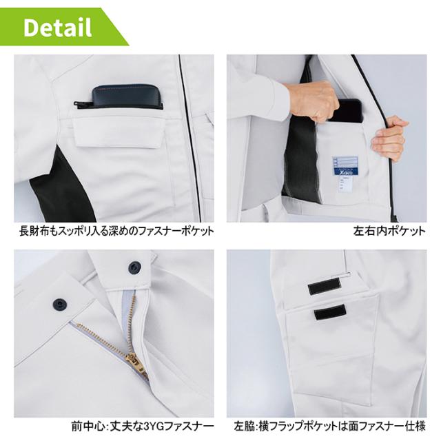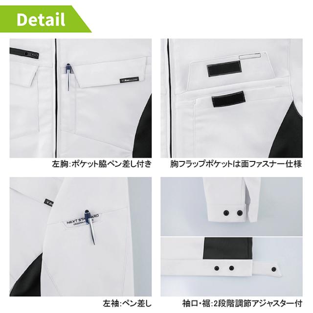 ◇機能:バイオペット・伸縮素材・帯電防止長財布もすっぽり入る深めのファスナーポケット・左胸ポケット脇ペン差し付・JIS T8118帯電防止作業服適合商品・胸フラップポケットはメンファスナー仕様・袖口は2段階に調整できるアジャスター付・左袖ペン差し・左右内ポケット・裾は2段階で調整できるアジャスター付