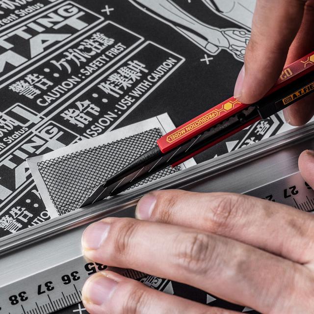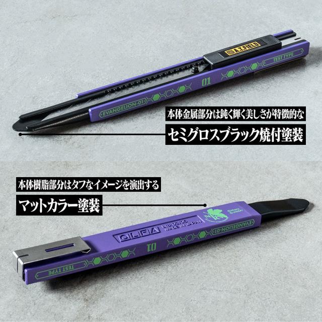 劇中に登場する機体をモチーフにしたカラーリングに、機体名称表記やハニカムパターンなどのエヴァンゲリオンらしいメカニカルなあしらいを組み合わせたデザインのカッターナイフです。