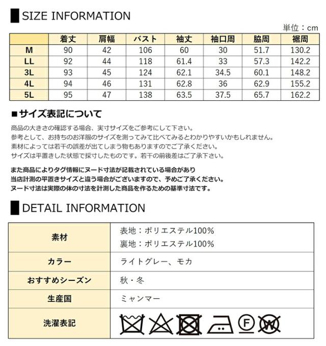 4L:着丈94 肩幅46 バスト131 袖丈62.8 袖口周36 脇周62.9 裾周155.2