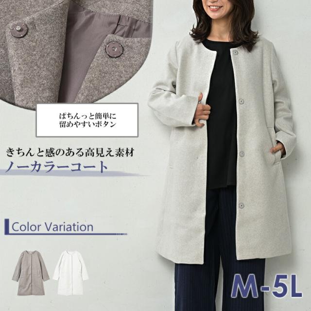 大きいサイズ レディース ノーカラーコート 長袖 ロング丈 スナップボタン ポケット アウター M/LL/3L/4L/5L ゆったりサイズ ぽっちゃり女子 プラスサイズ