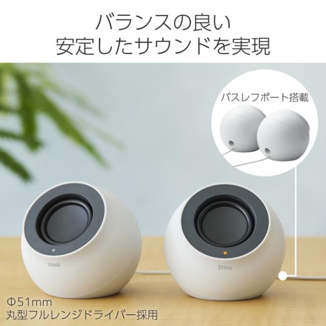 ■コロンとした球体ボディで暮らしの空間に自然になじむ、実用最大出力4.4Wの2.0chステレオスピーカー“Stina(スティーナ)”です。 ■Bluetooth(R)通信/USB Type-C(TM)プラグ/USB-A/φ3.5mmミニプラグの4種類に対応し、さまざまな機器と接続可能。多様な環境でステレオサウンドを手軽に楽しめます。 ■USB Type-Cコネクターで電源を供給することができます。ノートパソコンやお手持ちのUSB充電器から給電が可能です。 ■付属のUSB-A変換アダプターを使用することで、USB-A搭載のパソコンやAC充電器にもご使用可能です。 ■φ51mmの丸型フルレンジドライバーを採用。背面にはバスレフポートを搭載することで低音域も響かせ、バランスのよい安定したサウンドを実現します。 ■スピーカーは正面より少し上向きに音を発する設計です。ディスプレイの下など低い位置に設置しても音楽が耳元までしっかり届きます。 ■手元で簡単にボリュームを調整できるボリュームコントローラーを搭載しています。 ■4種類の接続方法は、コントローラーのボタンを長押しするだけで切り替えることができ、コントローラーのLEDで現在の接続モードを確認可能です。 ■なめらかな丸みを帯びたボディでデスク周りに自然に溶け込み、インテリアの一部として空間と調和するスピーカーです。 ■スピーカーは左右それぞれコンパクトな手のひらサイズ。場所を取らずどこでも音楽を楽しめます。 ■※電源を供給する機器によっては、ノイズが大きく聞こえる場合があります。ノイズが気になる場合は、他のパソコンやUSB充電器など別の機器から電源を供給してください。 ■※USB Type-C and USB-C are trademarks of USB Implementers Forum. ■自社環境認定基準を1つ以上満たし、『THINK ECOLOGY』マークを表示した製品です。 ■廃棄物削減に取り組み、製品に同梱する取扱説明書等をペーパーレス化した製品です。 ■環境保全に取り組み、製品の包装容器におけるプラスチック重量を、社内基準製品より20%以上削減した製品です。 ■環境保全に取り組み、製品の包装容器が紙・ダンボール・ポリ袋のみで構成されている製品です。