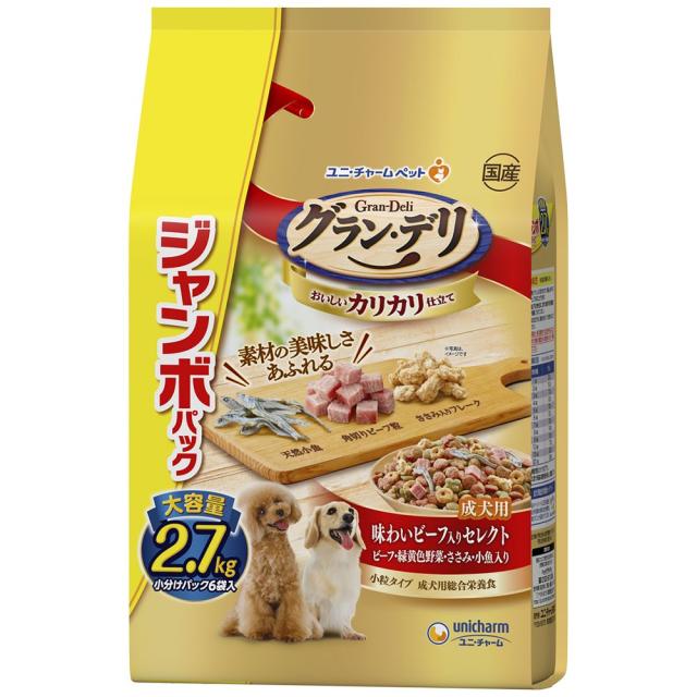 ユニ・チャーム グラン・デリ カリカリ仕立て 成犬用 味わいビーフ入り セレクト ビーフ・緑黄色野菜・ささみ・小魚入り 2.7kg