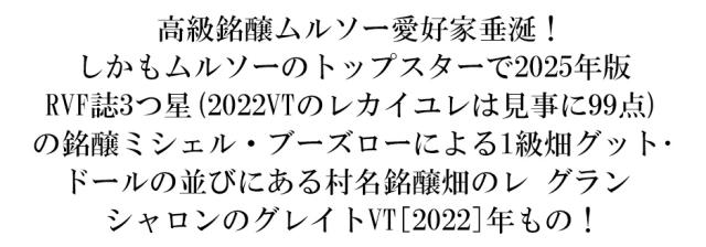 高級銘醸ムルソー愛好家垂涎! しかもムルソーのトップスターで2025年版 RVF誌3つ星(2022VTのレカイユレは見事に99点) の銘醸ミシェル・ブーズローによる1級畑グット・ ドールの並びにある村名銘醸畑のレ グラン シャロンのグレイトVT[2022]年もの!