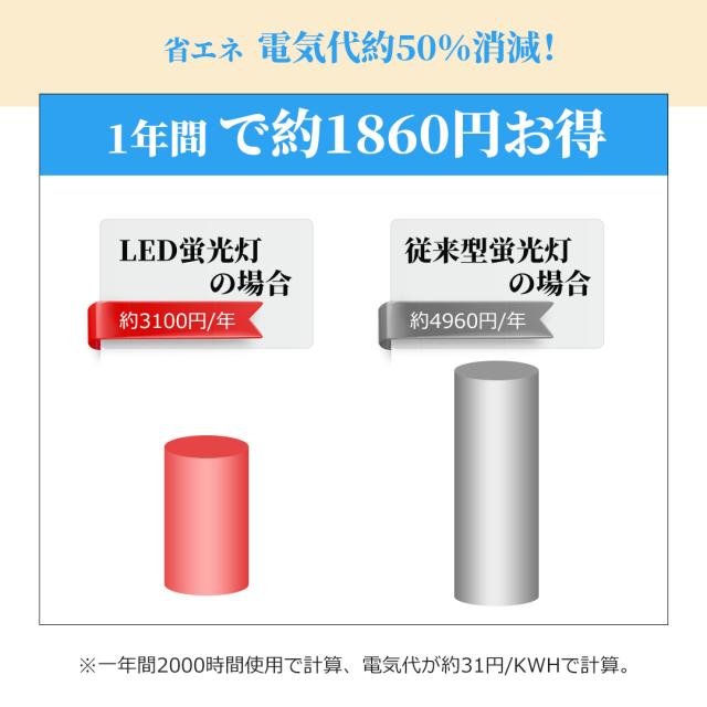 - 通常の蛍光灯の1/2の消費電力で、電気代が大幅に節約できます。 通常の蛍光灯の約4〜8倍長寿命。交換の手間も少なくてすみます。