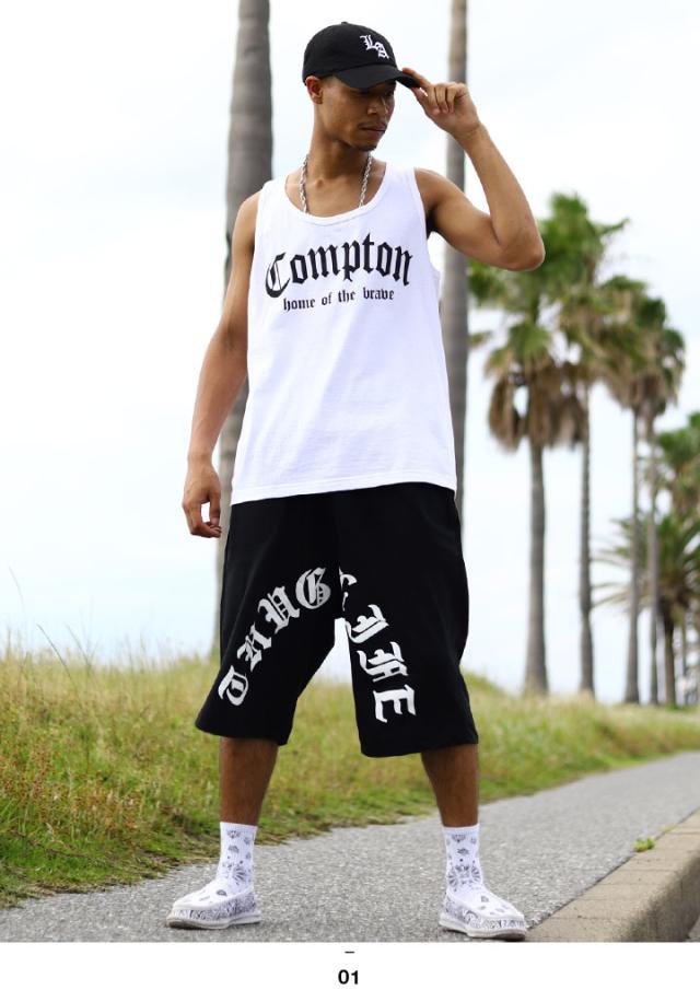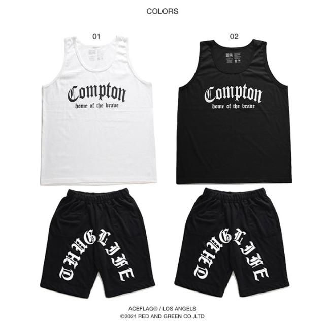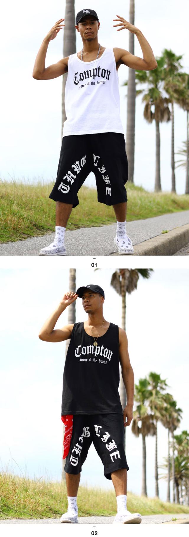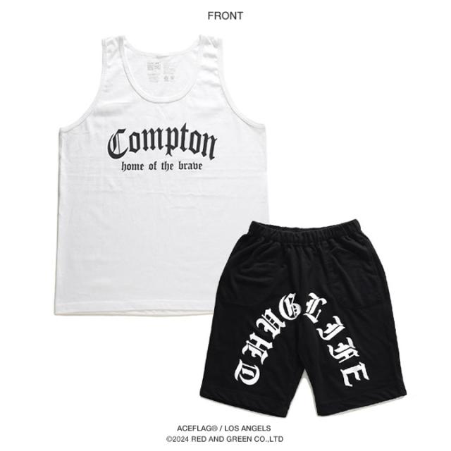 N.W.A.を輩出し、Straight Outta Comptonの舞台としても知られている「Compton」をドロップしたタンクトップと「THUG LIFE」をアーチロゴでドロップしたスウェットハーフパンツの上下セット。