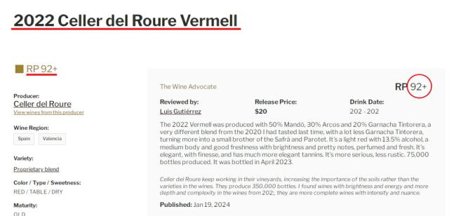 『香りはシャープ、フレッシュでピュアかつエレガント。レッド・ベリー、リコリス、薫り高いハーブ、さらにモナストレル種と分かるエスパルト草の印象も。口中ではミディアム・ボディで、それほど複雑ではないものの、明瞭で凝縮している。レースのような繊細なテクスチャーがとても快適な飲み心地にさせており、本当に美味しい。』