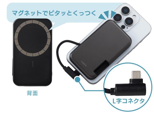 ●マグネット式になっており、MagSafe 対応 iPhone の背面に固定して使えます。