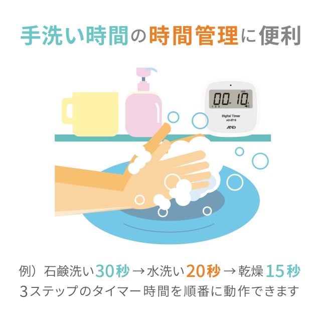 石鹸洗い30秒→水洗い20秒→乾燥15秒などの3ステップのタイマー時間を順番に動作できます