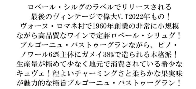 ロベール・シルグのラベルでリリースされる 最後のヴィンテージで偉大V.T2022年もの! ヴォーヌ・ロマネ村で1960年創業の非常に小規模 ながら高品質なワインで定評ロベール・シリュグ! ブルゴーニュ・パストゥーグランながら、ピノ・ ノワール62%主体にガメイ38%で造られる本格派! 生産量が極めて少なく地元で消費されている希少な キュヴェ!程よいチャーミングさと柔らかな果実味 が魅力的な極旨ブルゴーニュ・パストゥーグラン!