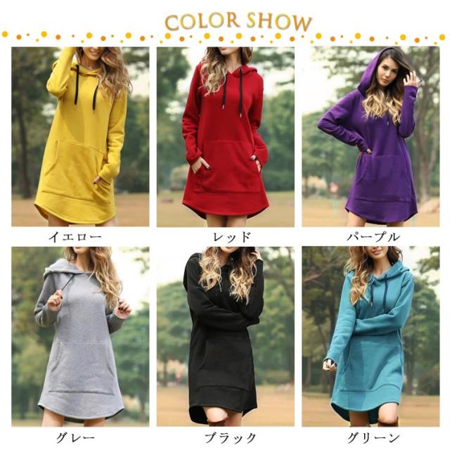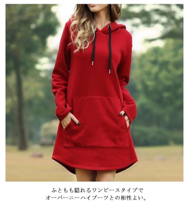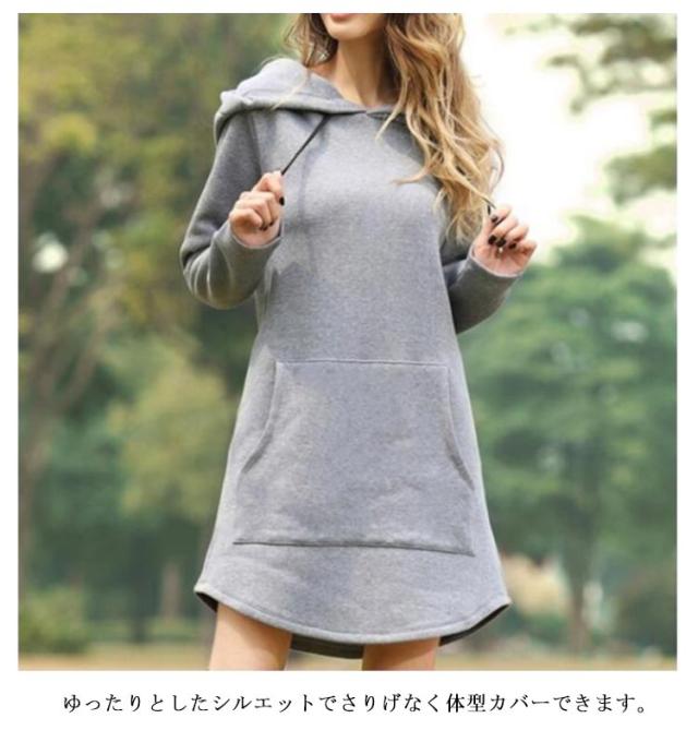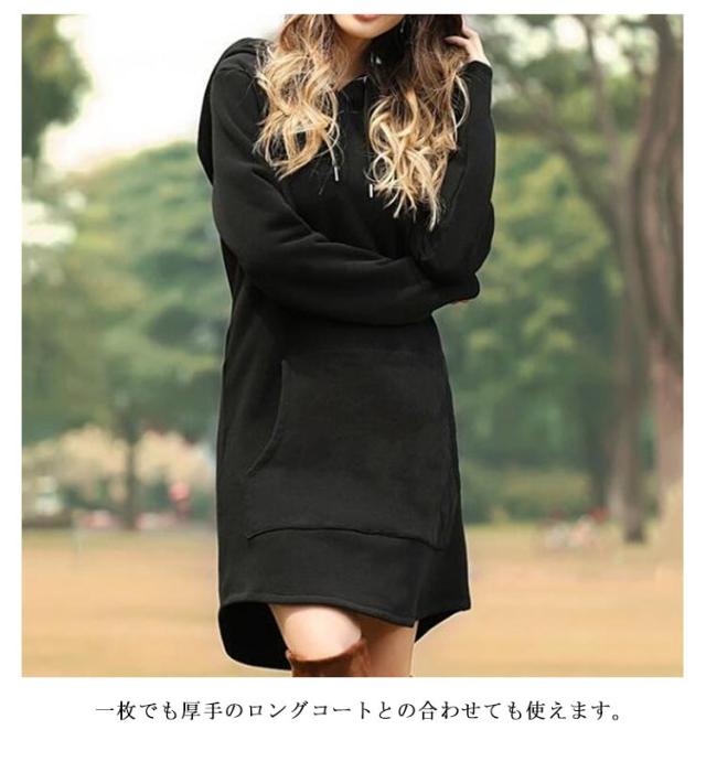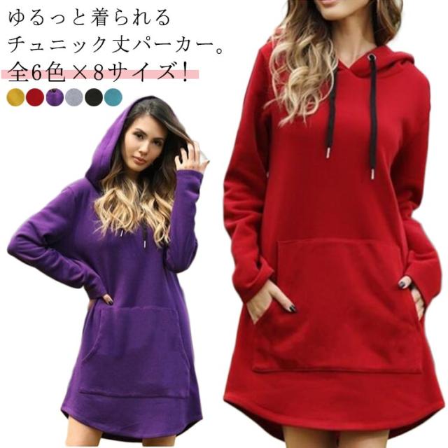 ロングパーカー レディース パーカー ワンピース 秋冬 フード付き プルオーバーパーカー パーカーワンピース 膝上丈 ゆったり 大きサイズ カジュアル 服 体型カバー 送料無料