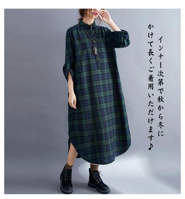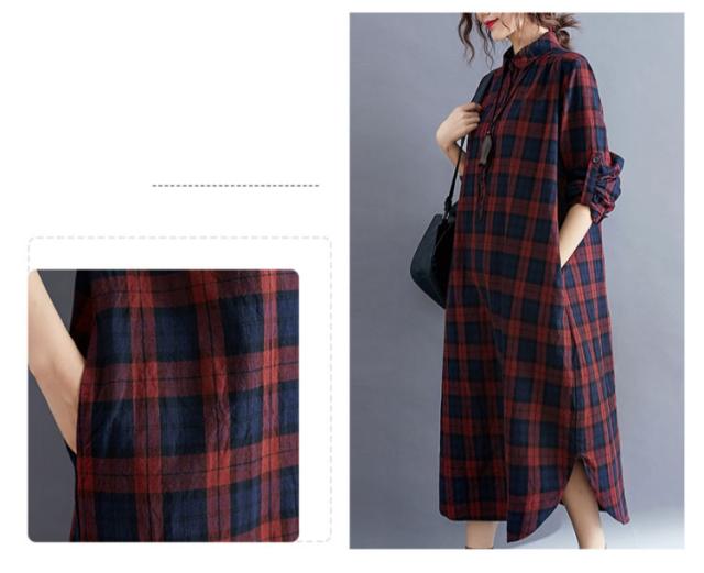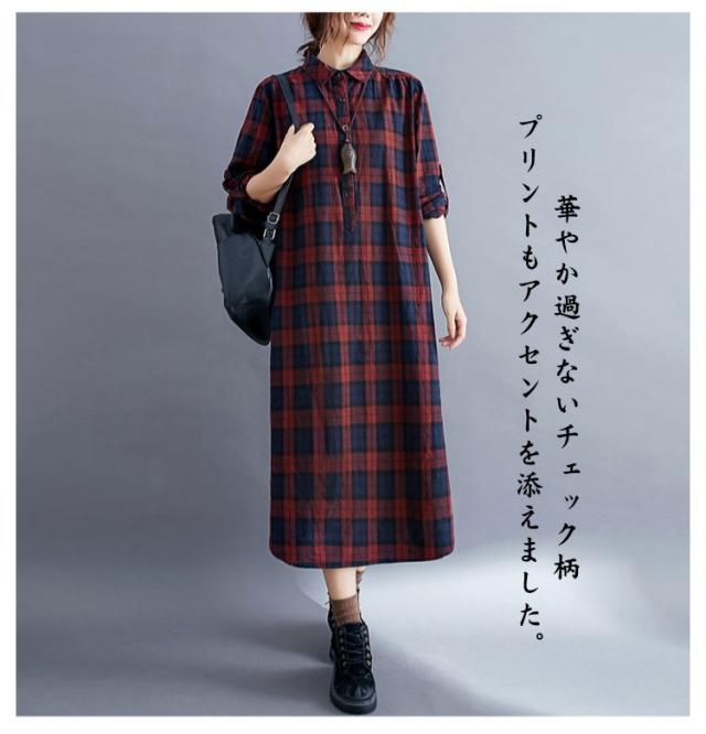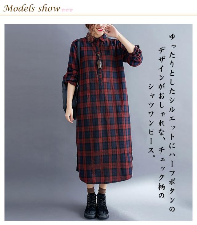 大きいサイズ シャツ レディース 春秋 長袖 ロング丈 ゆったり 襟付き ハーフボタン マキシ丈 シャツワンピース 体型カバー ポケット付き 羽織 着?せ チェック柄 冬 マキシシャツ マキシワンピース トップス 大人 女性