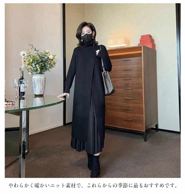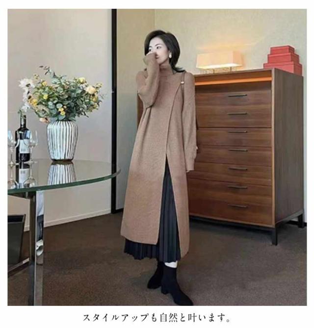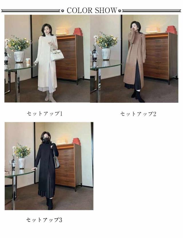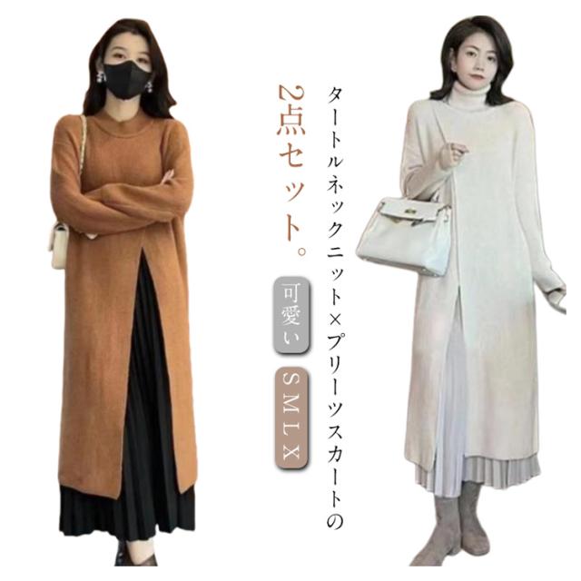 セーター レディース セットアップ ニットトップス ビッグスリット 可愛い プリーツスカート 長袖 ロング丈 ビッグスリット 上下セット お洒落 タートルネック エレガント ガーリー S M L