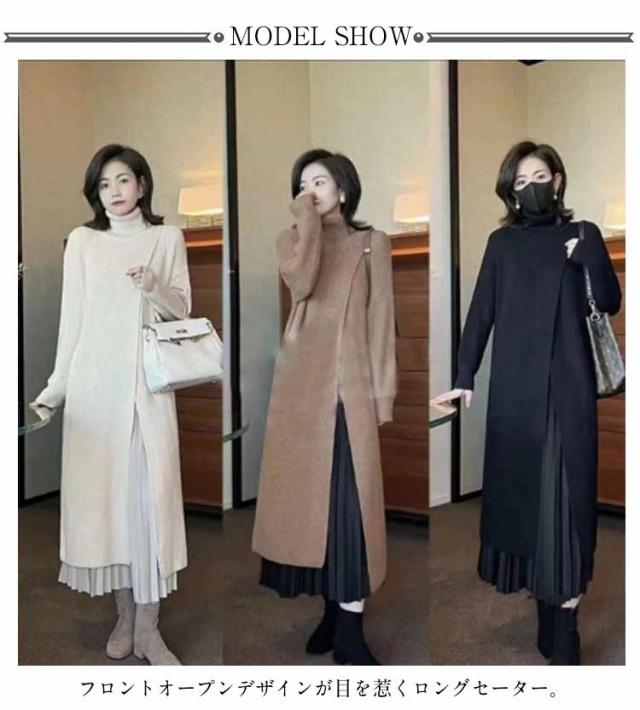 | タートルネックニット×プリーツスカートの2点セット。 フロントオープンデザインが目を惹くロングセーター。 一枚もレイヤードも映えます。 スタイルアップも自然と叶います。 やわらかく暖かいニット素材で、これらからの季節に最もおすすめです。 セットアップで着用するのはもちろん、単品としても着回しがしやすいです。 | |