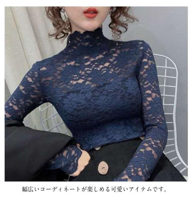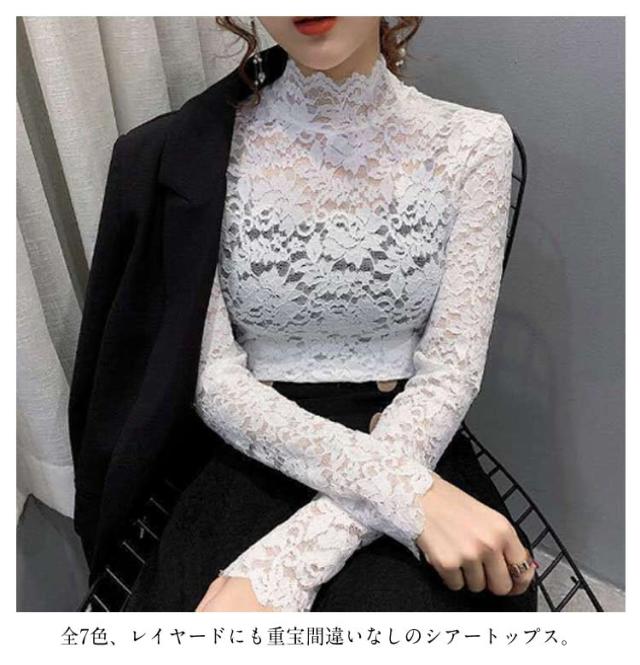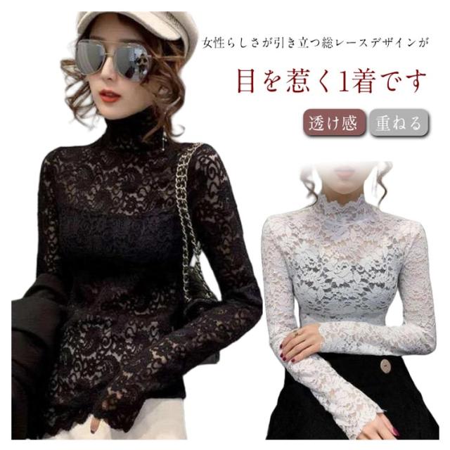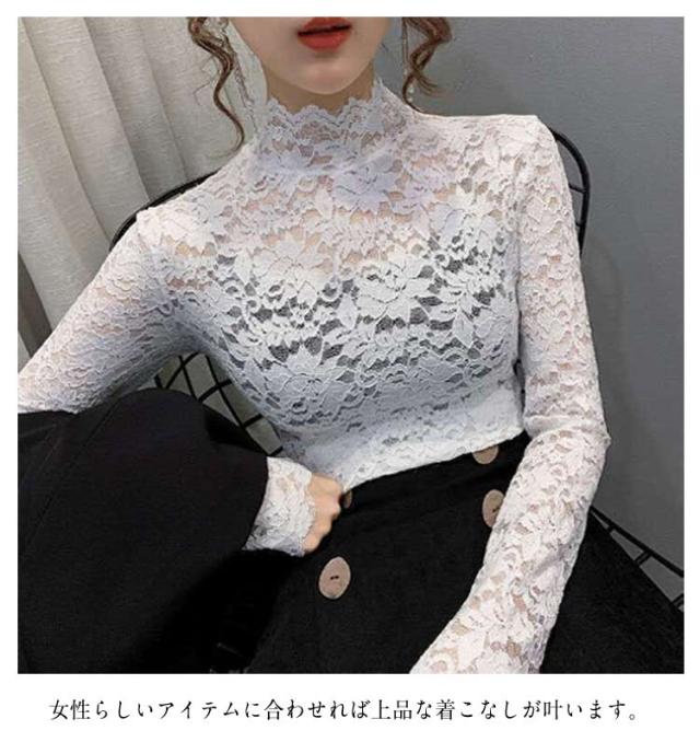 S 長袖 レース 総レース ハイネック レディース シースルー レーストップス 総レース セクシー 透け感 重ねる 大人 インナーシャツ レイヤード フラワーレース M L XL