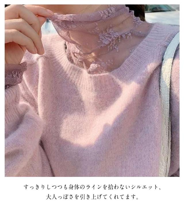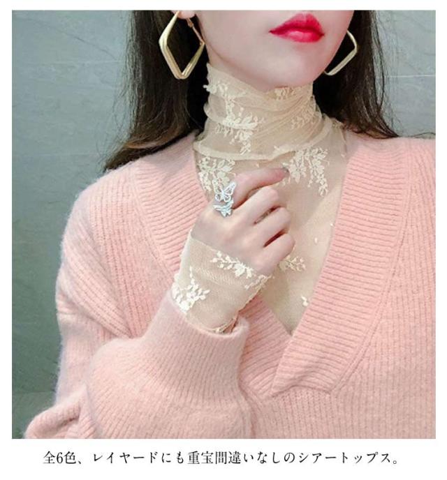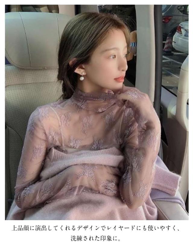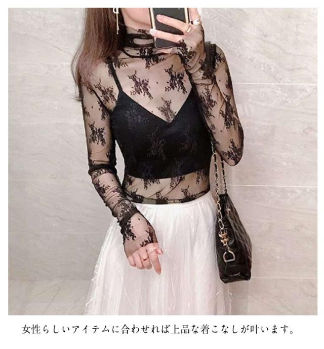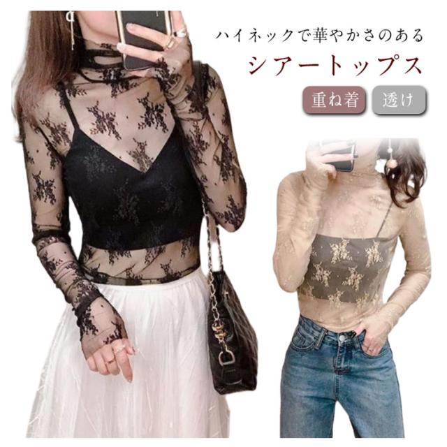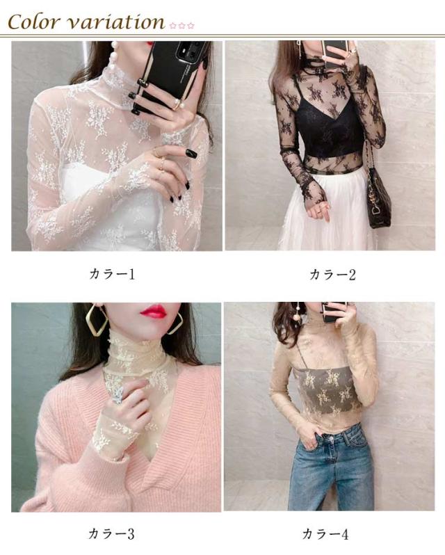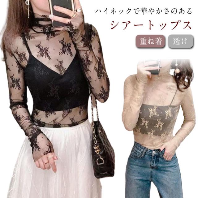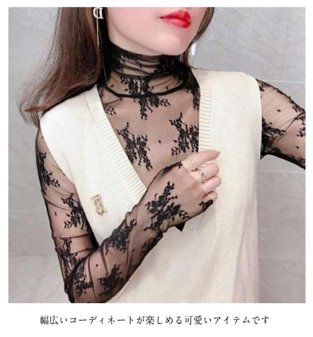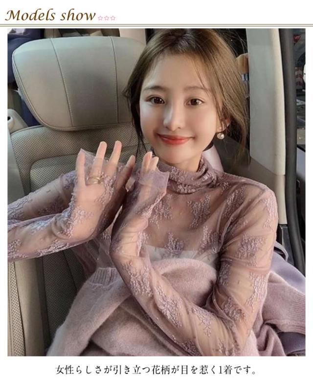 レース チュール チュール シースルー トップス ハイネック レディース トップス レイヤードトップス ハイネック 長袖 タイト きれいめ 重ね着 透け 花柄 S M L XL
