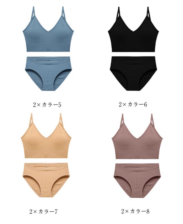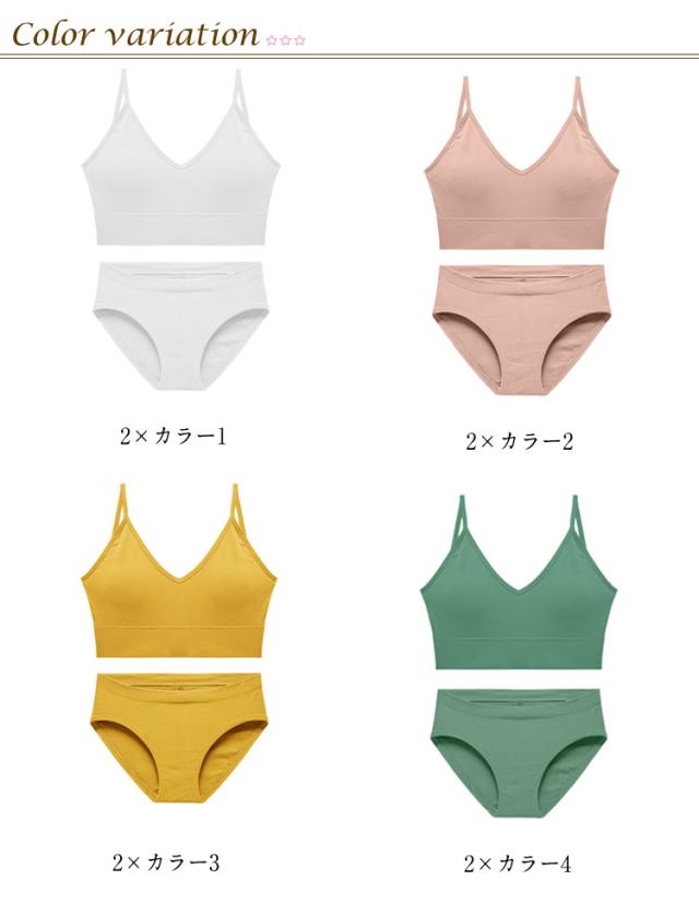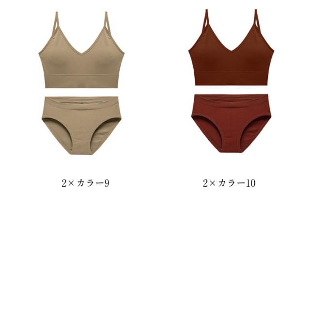 | 全10色、カジュアルなデザインのブラジャー&ショーツの2点セットです。 お得な2ペア(4点)セット!(ブラジャー*2+ショーツ*2) ノンワイヤーブラと、スタンダードショーツ。 普段用のインナーとしてはもちろん、運動時にもおすすめです。 | |