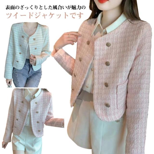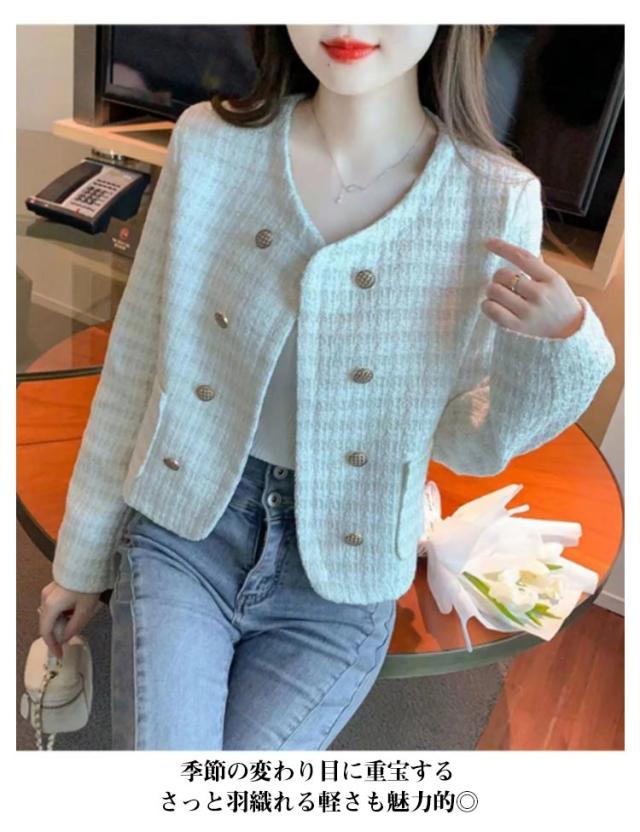 ツイードジャケット ポケット付き 羽織り ツイードジャケット アウター ジャケット ゴールドボタン ツイード ノーカラー カラーレス カジュアル 長袖ジャケット フォーマル オフィス ママスーツ ビジネス ノーカラージャケット 上品 大人 送料無料 ホワイト