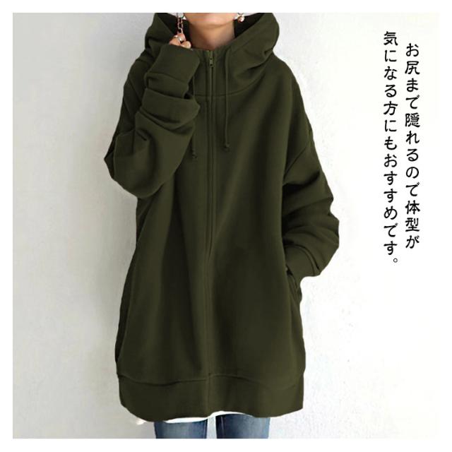 ロングパーカー フード付き パーカー ロング丈 ジップパーカー 裏起毛 スウェット ジップアップパーカー ボリュームネック レディース 体型カバー 長袖 無地 トップス 着痩せ あったか おしゃれ ゆったり 大きいサイズ 防寒 秋冬