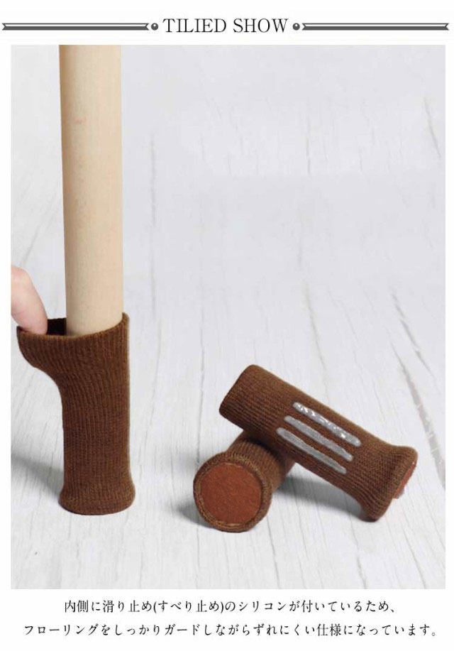 | チェアソックス 椅子カバー 4脚16個(イス4脚分)のセットです。 シンプルで無地の9タイプから展開しておりますので、お部屋に馴染むデザインで足元にアクセントを加えす。 フローリングや床の傷防止&床保護対策になる椅子カバーです。 フチがモコモコしたデザインで、当店人気のダイニング・インテリアコーディネートアイテムです。 足回りはタイプ1には最大15cm、タイプ2には17cmまで伸びるので、あらゆる形状の脚に対応しております。 ※ピアノ椅子、テーブル、机、デスク、いす、サイドテーブル等、幅の小さい脚であれば対応しております。 内側に滑り止め(すべり止め)のシリコンが付いているため、フローリングをしっかりガードしながらずれにくい仕様になっています。 | |