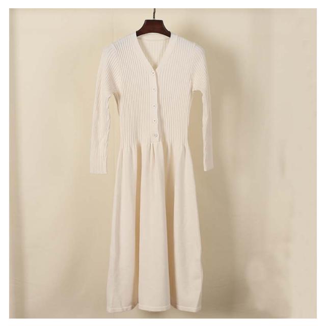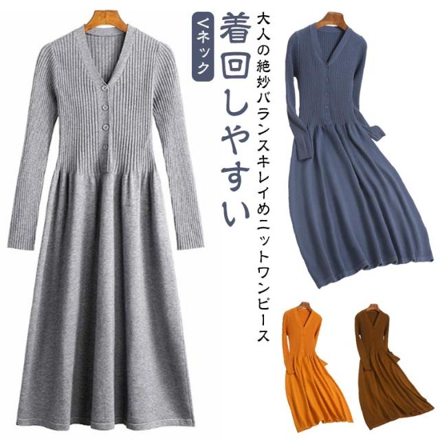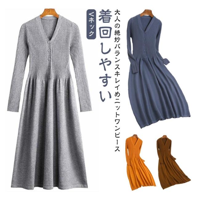 ニットワンピース 秋冬 大人 長袖 きれいめ ロング リブ ニット ワンピース フレア タイトワンピース ニットロングワンピース Vネック 大人 おしゃれ 春 秋 無地 キャメル オフホワイト ブラック ベージュ ブラウン グレーブルー 送料無料